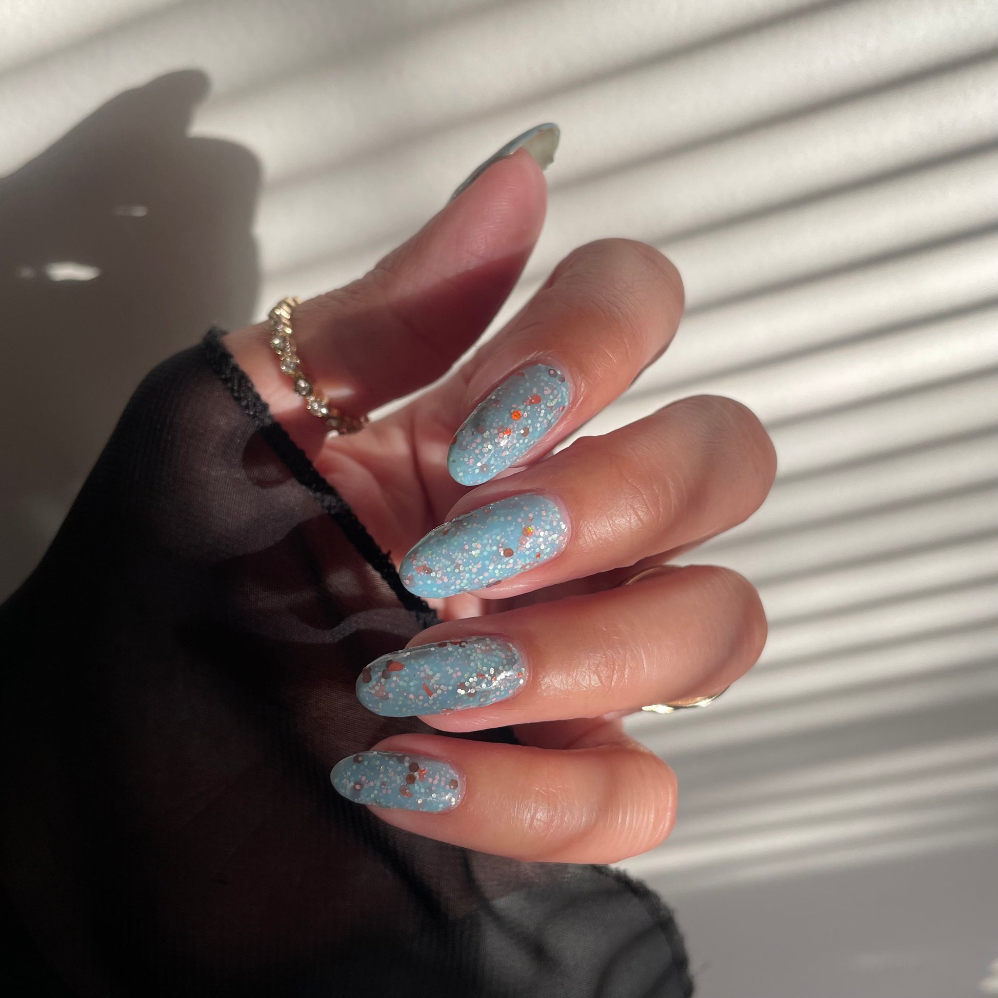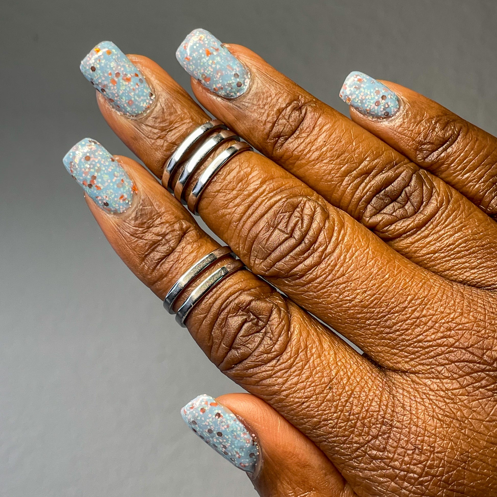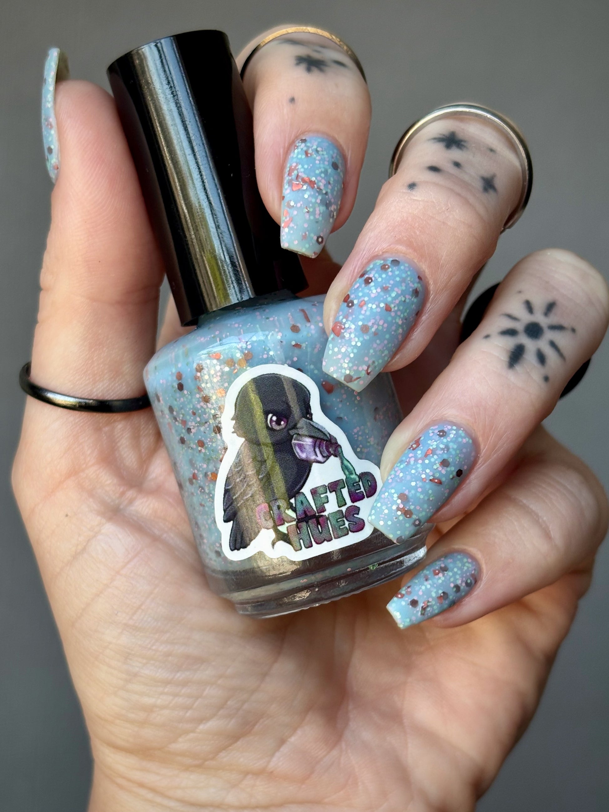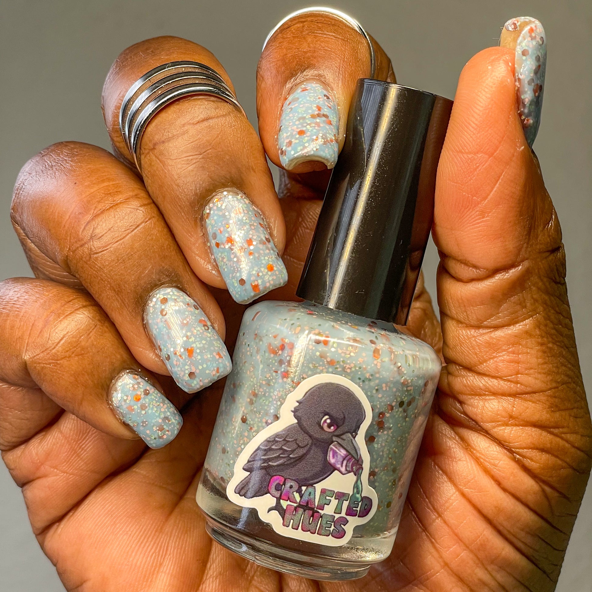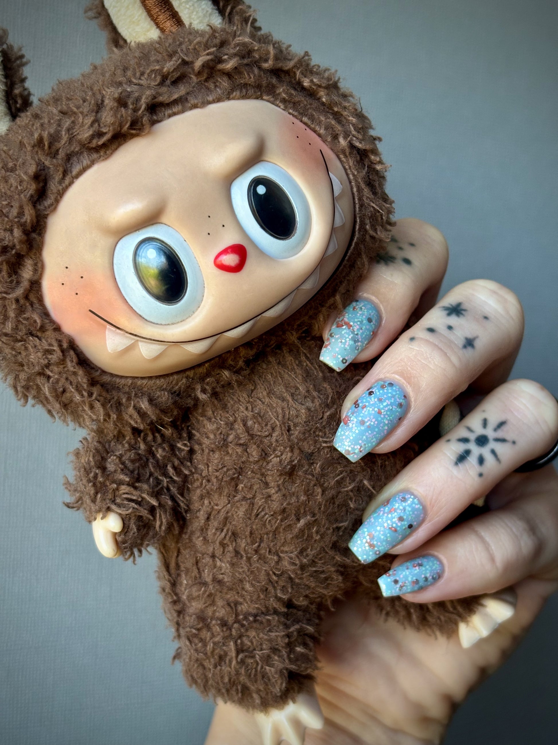 Inspired by the LABUBU - Exciting Macaron blind box! Tasty Little Devil’s Pets is a light blue crelly loaded with various shades of pastel glitters and orange brown shift glitters.