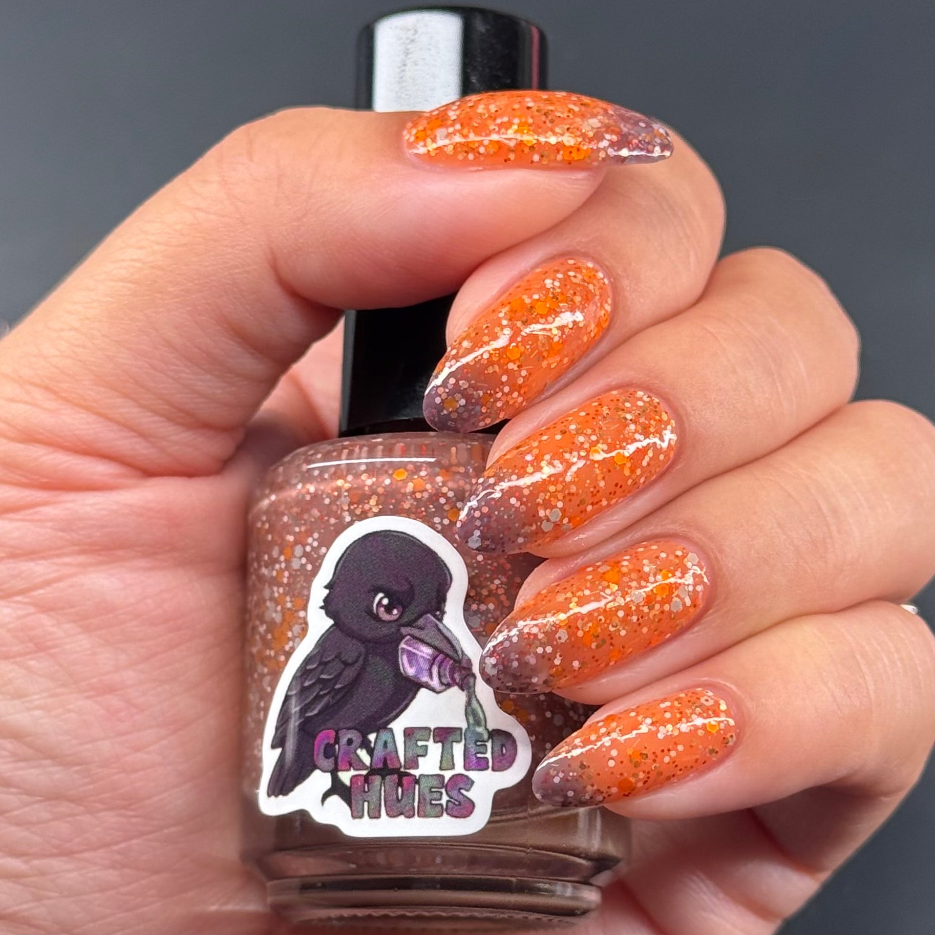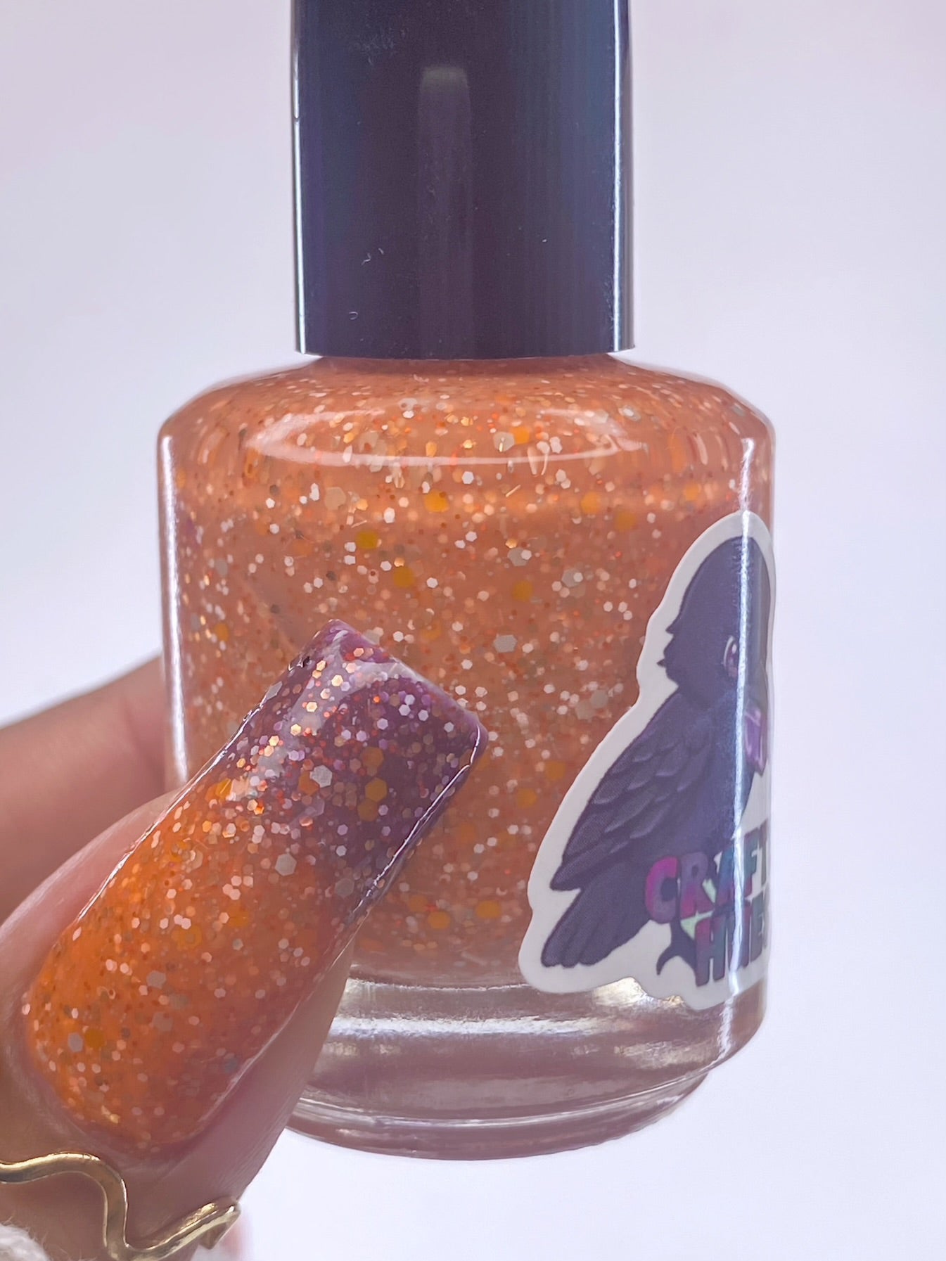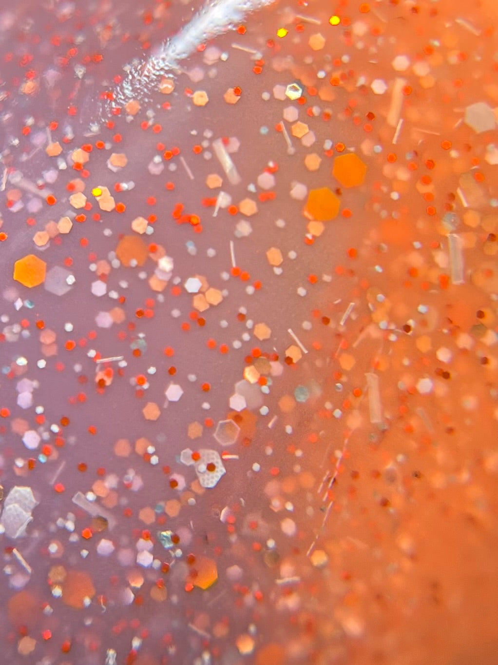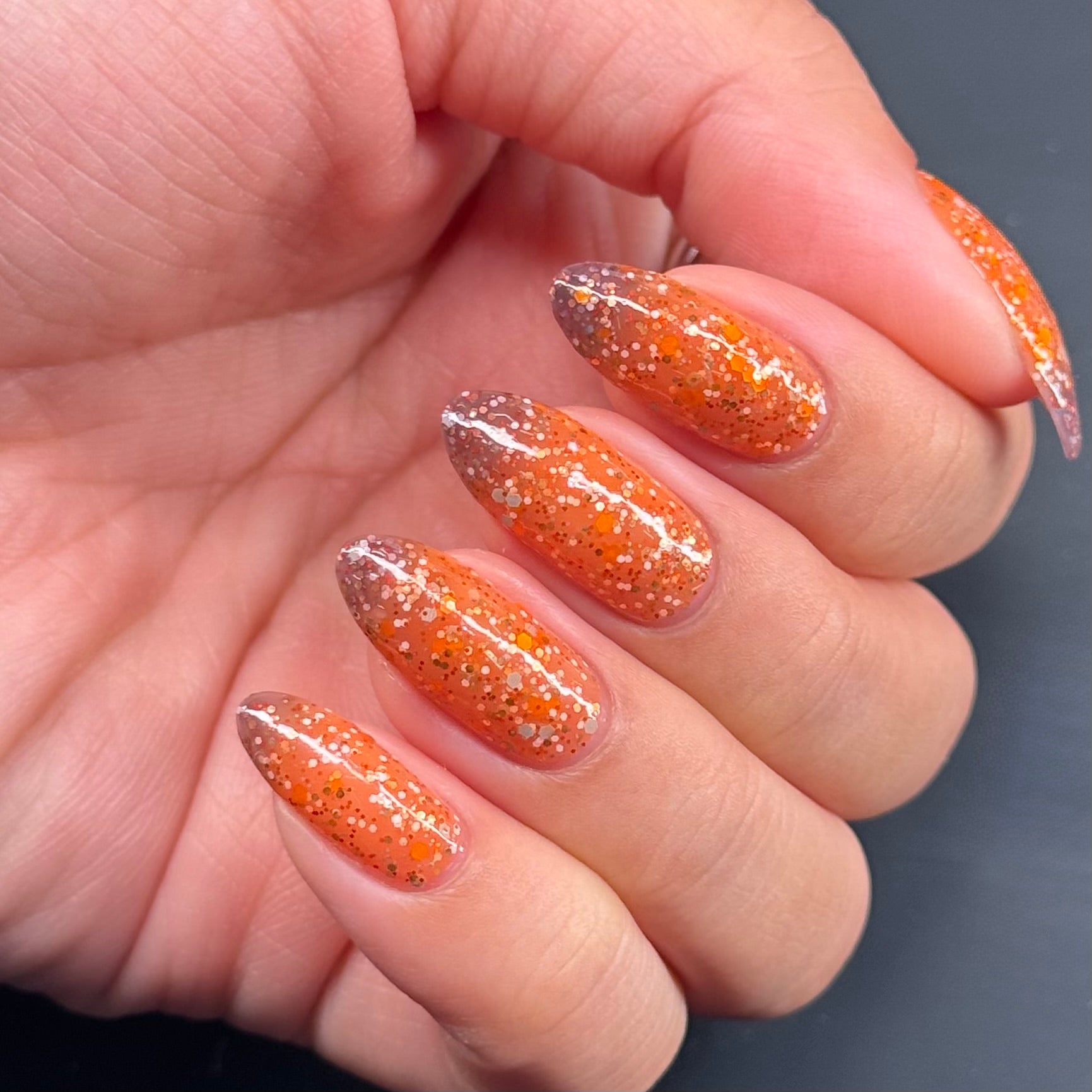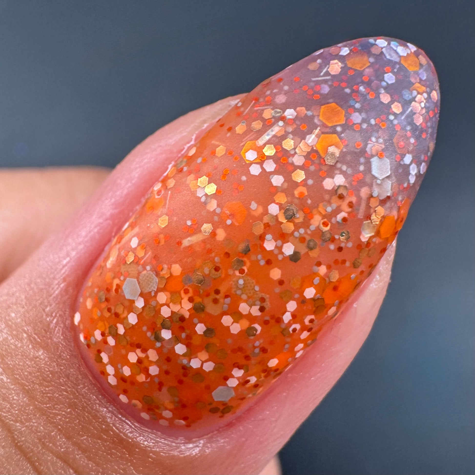 A thermal crelly that transitions from a berry when cold to squash when warm. Loaded with various shades or orange glitters and thin bar glitters.