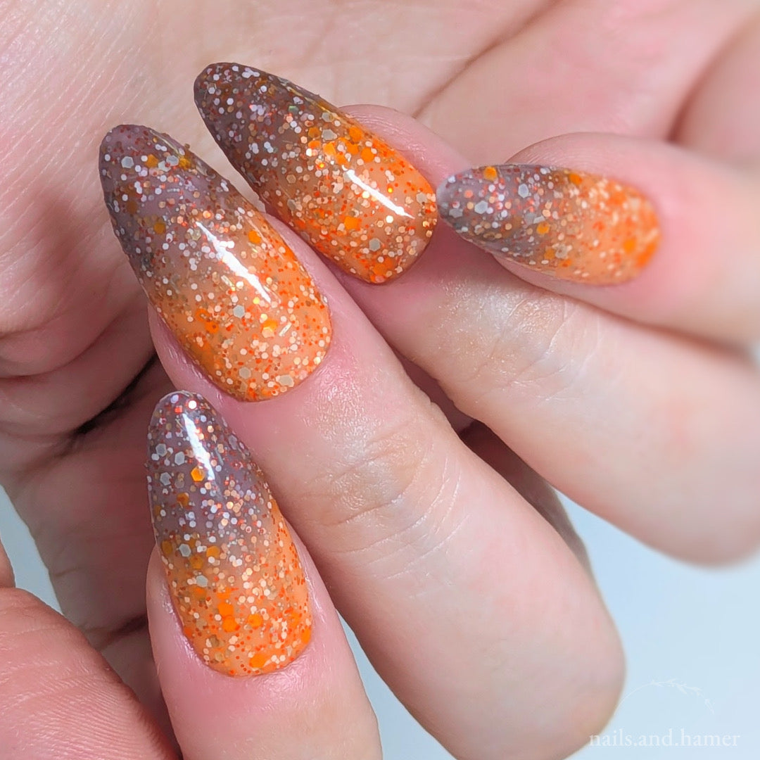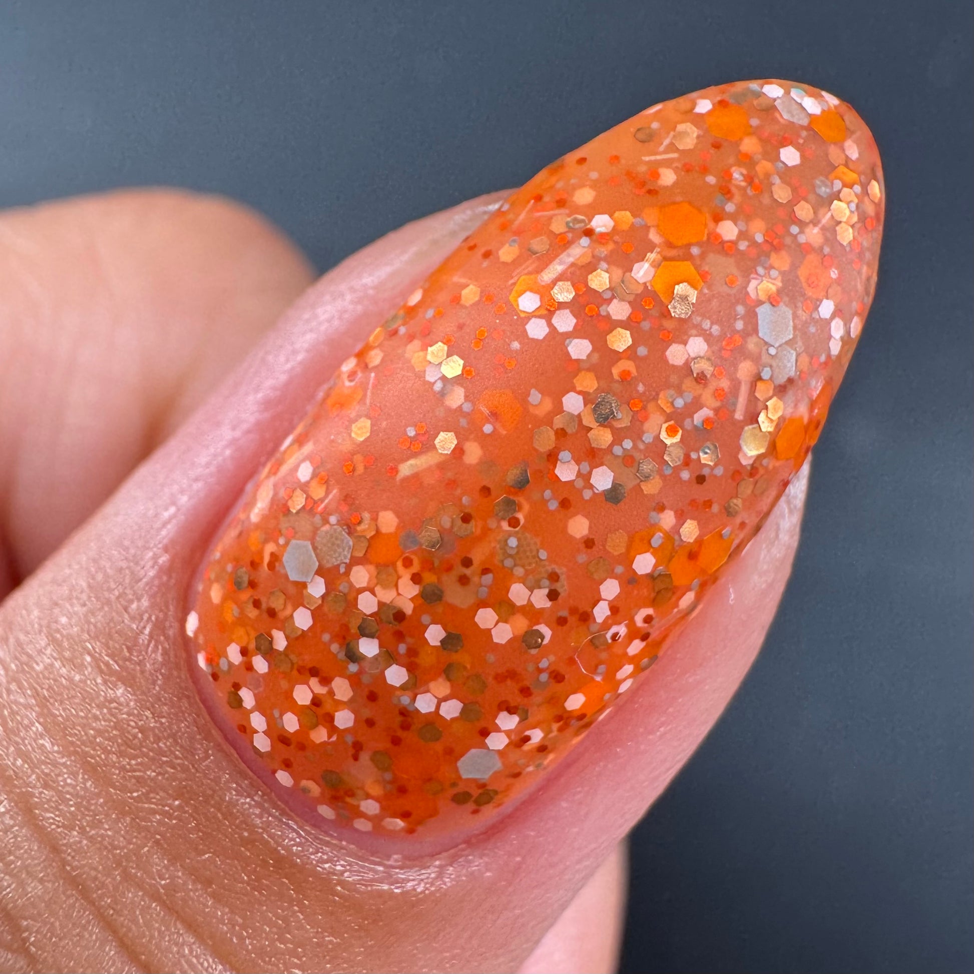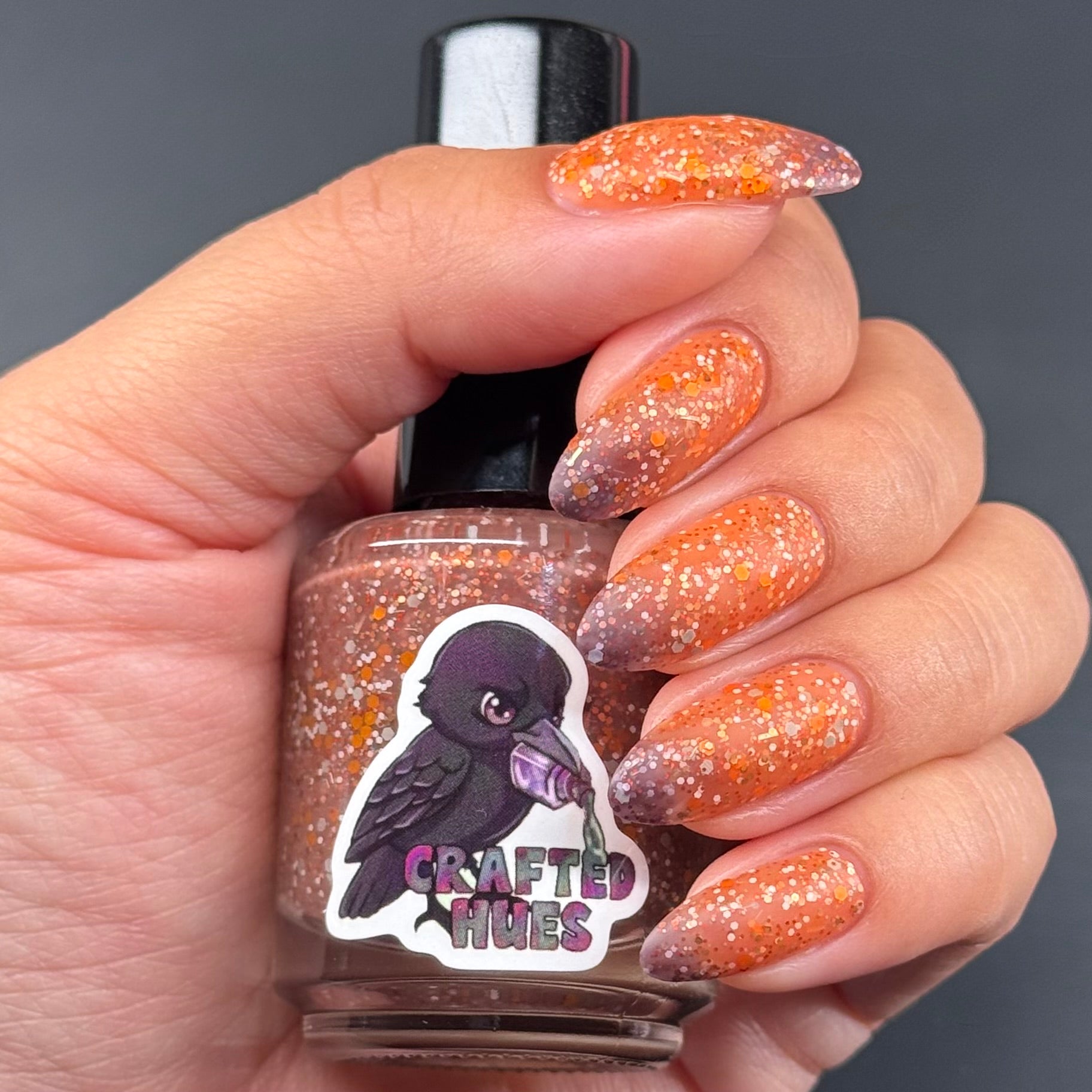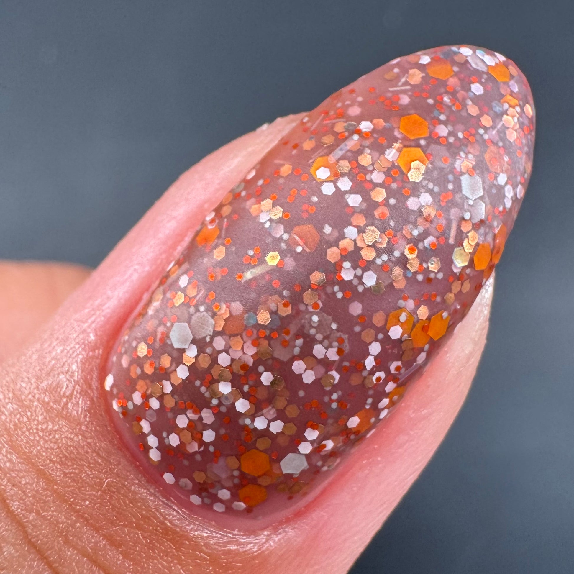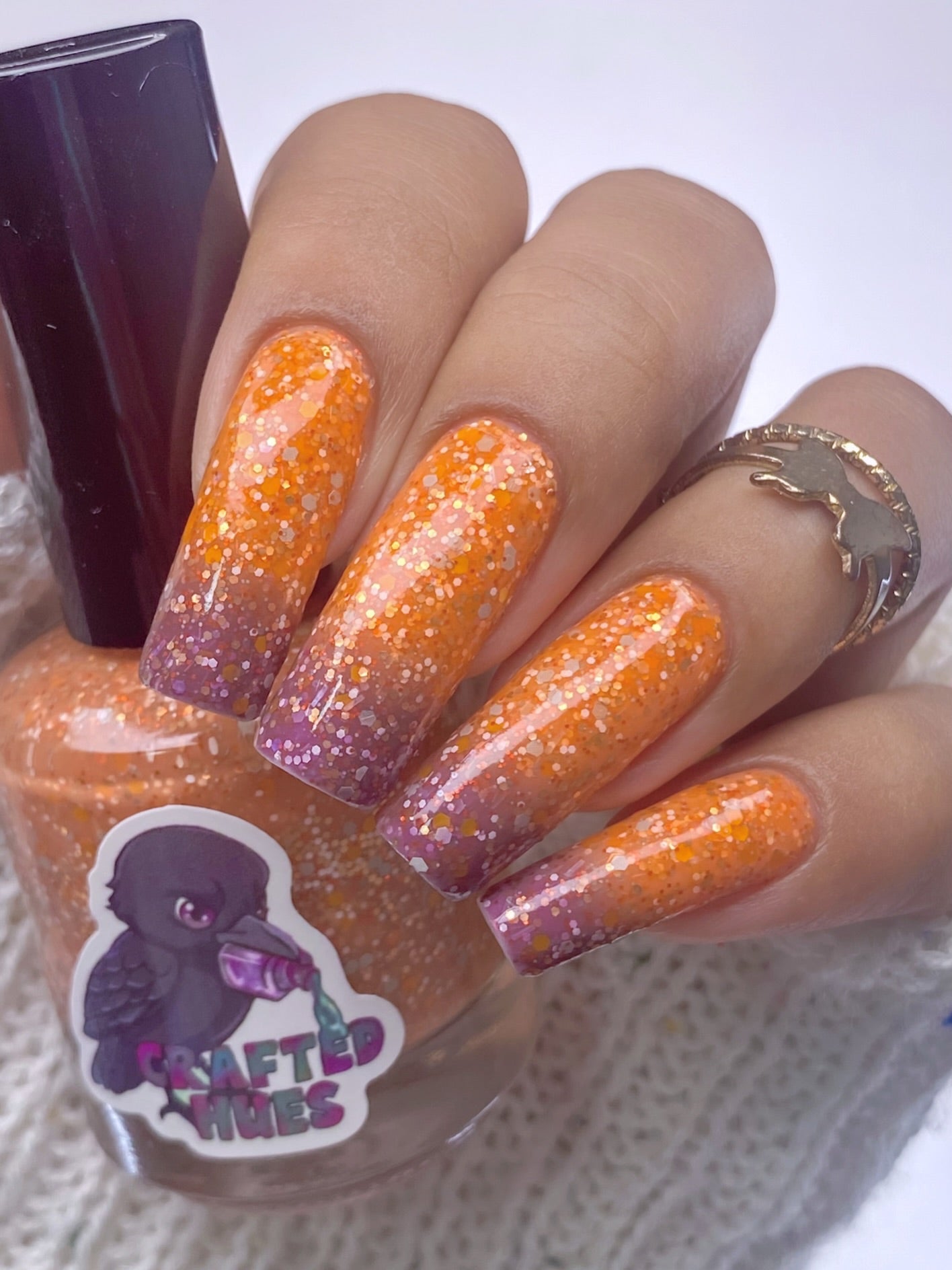 A thermal crelly that transitions from a berry when cold to squash when warm. Loaded with various shades or orange glitters and thin bar glitters.