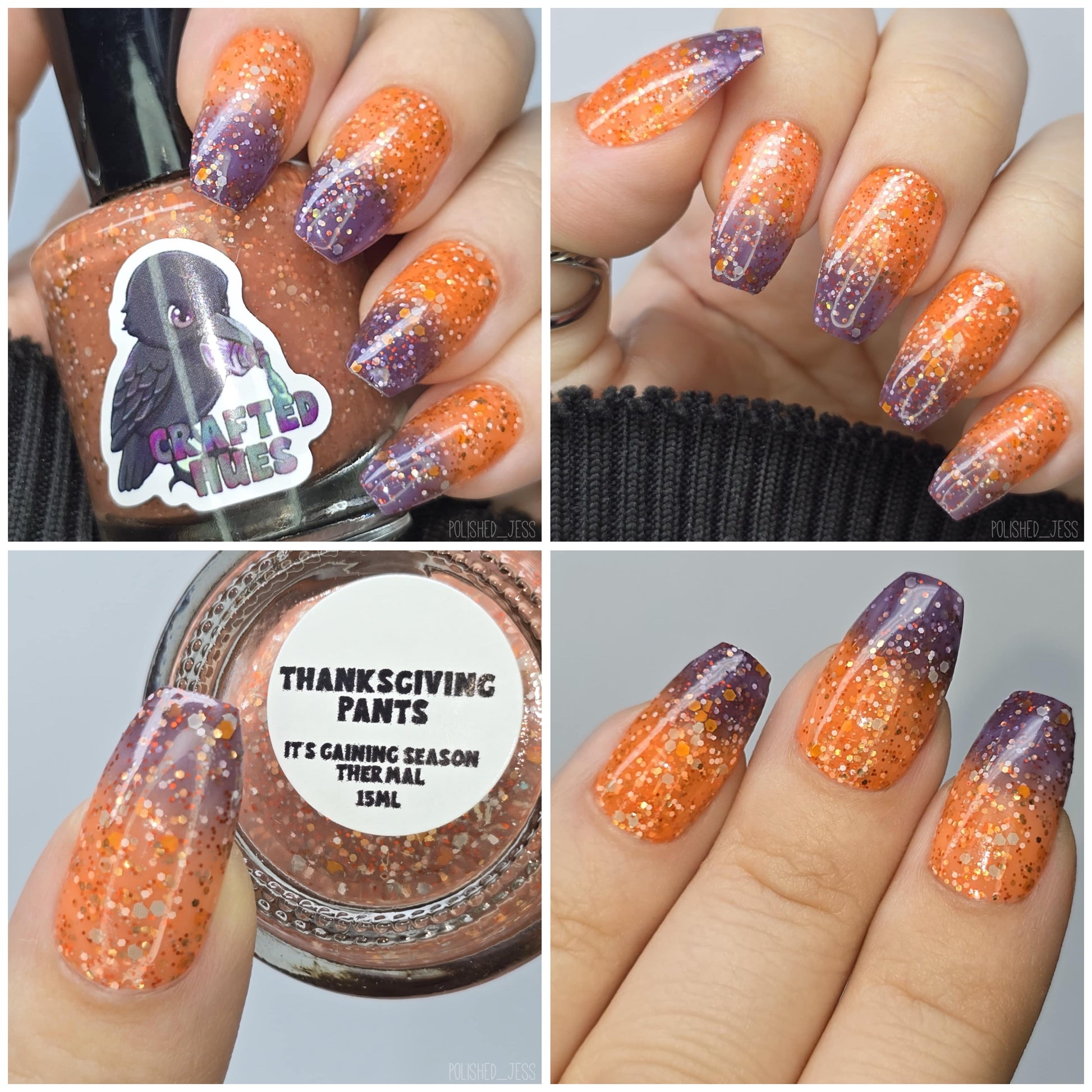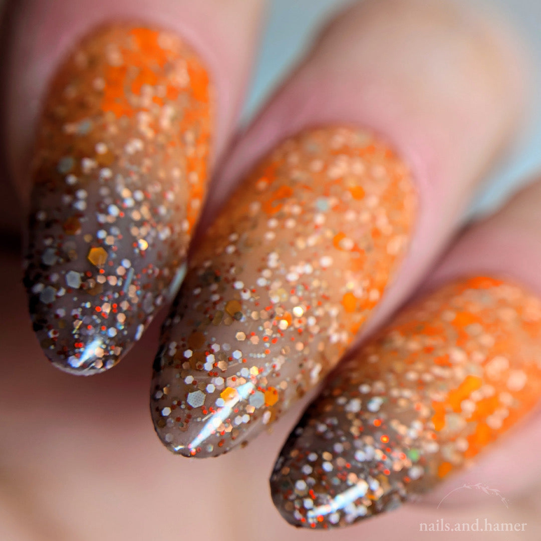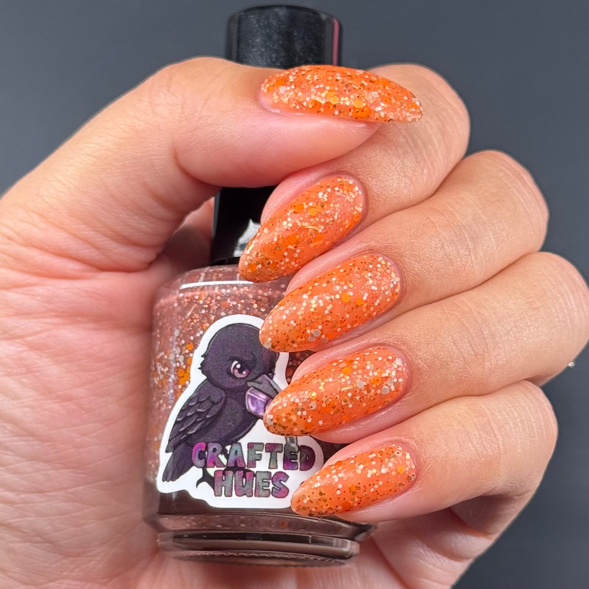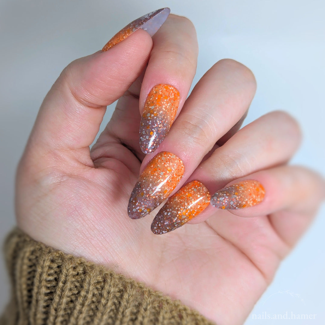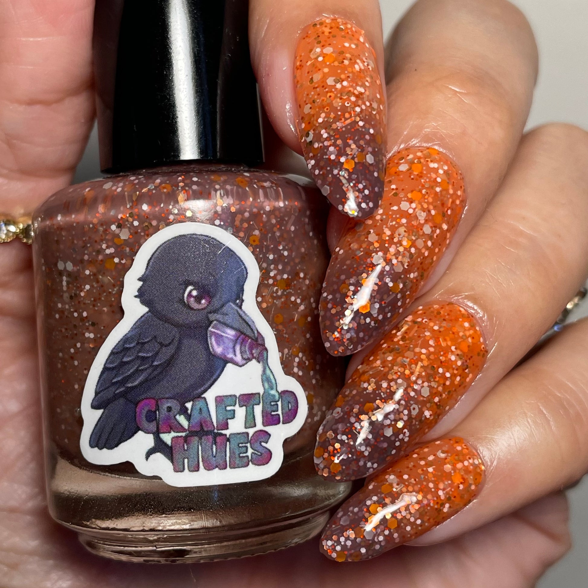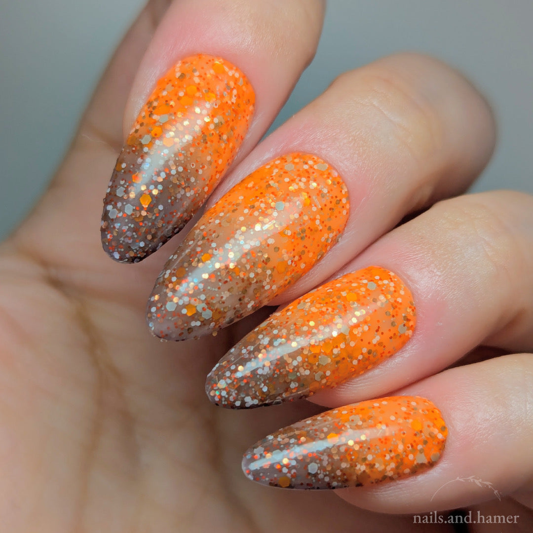 A thermal crelly that transitions from a berry when cold to squash when warm. Loaded with various shades or orange glitters and thin bar glitters.