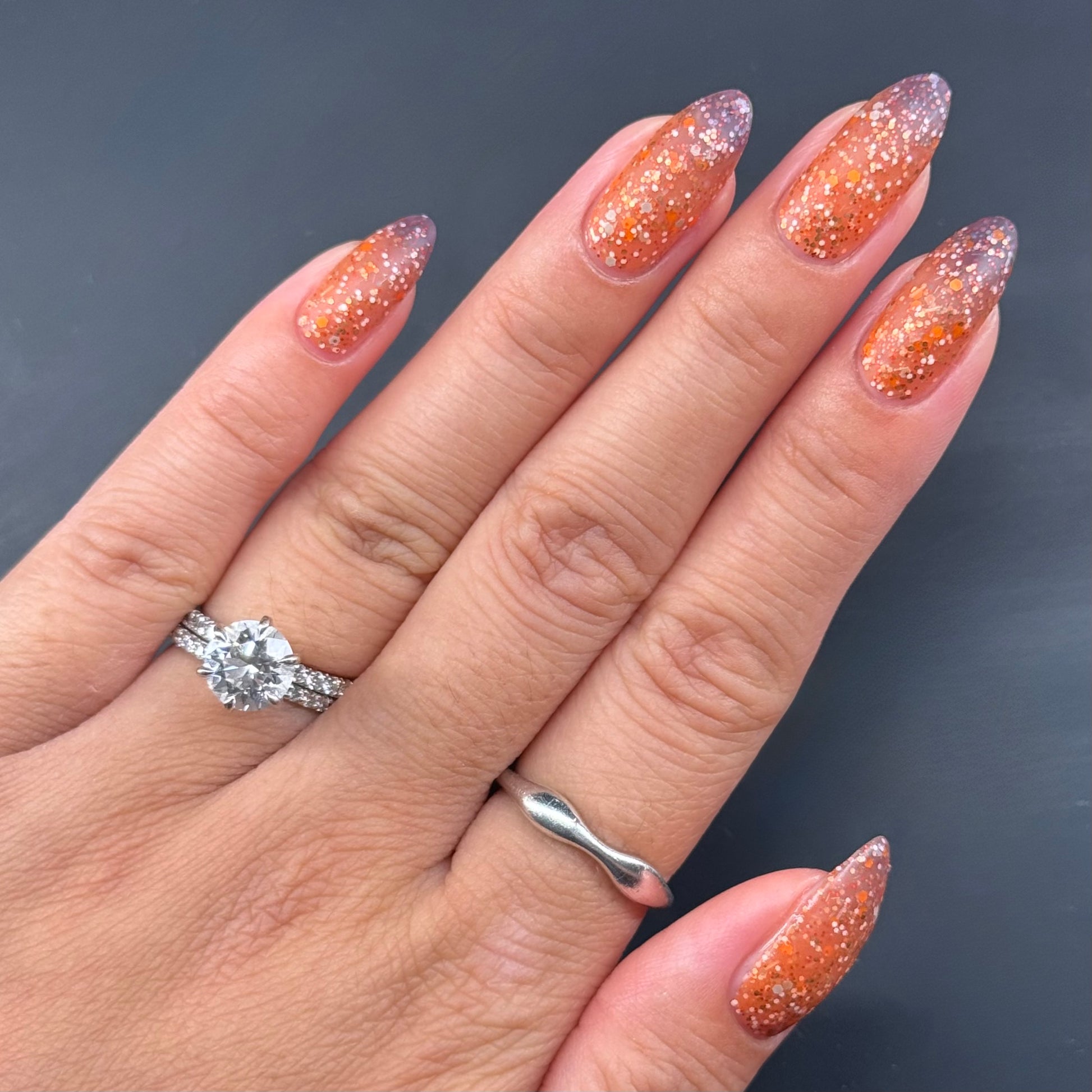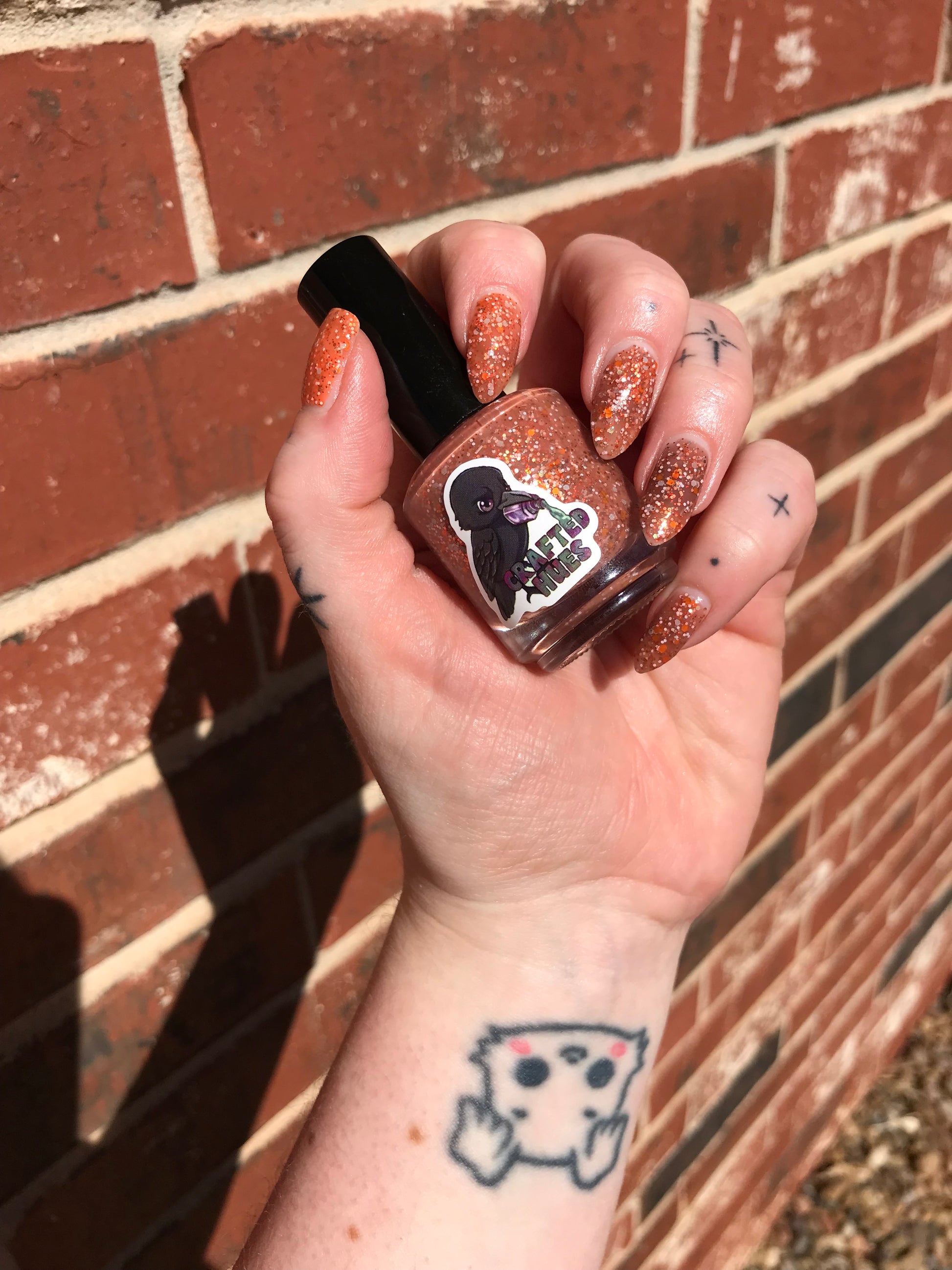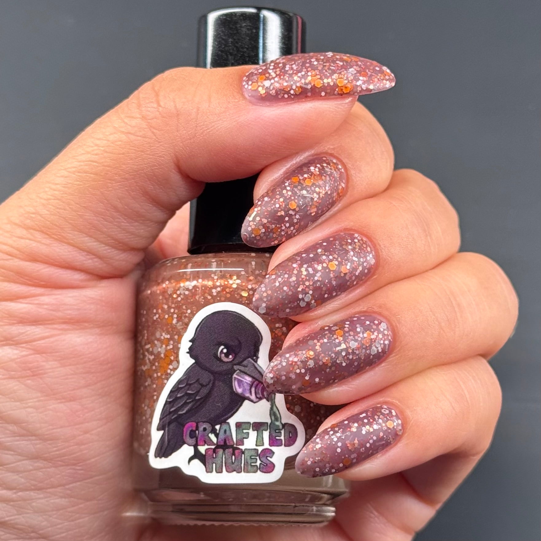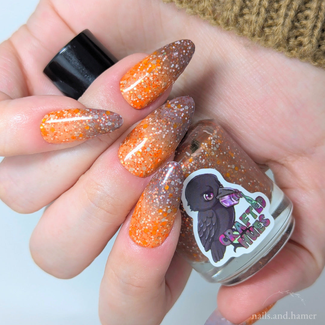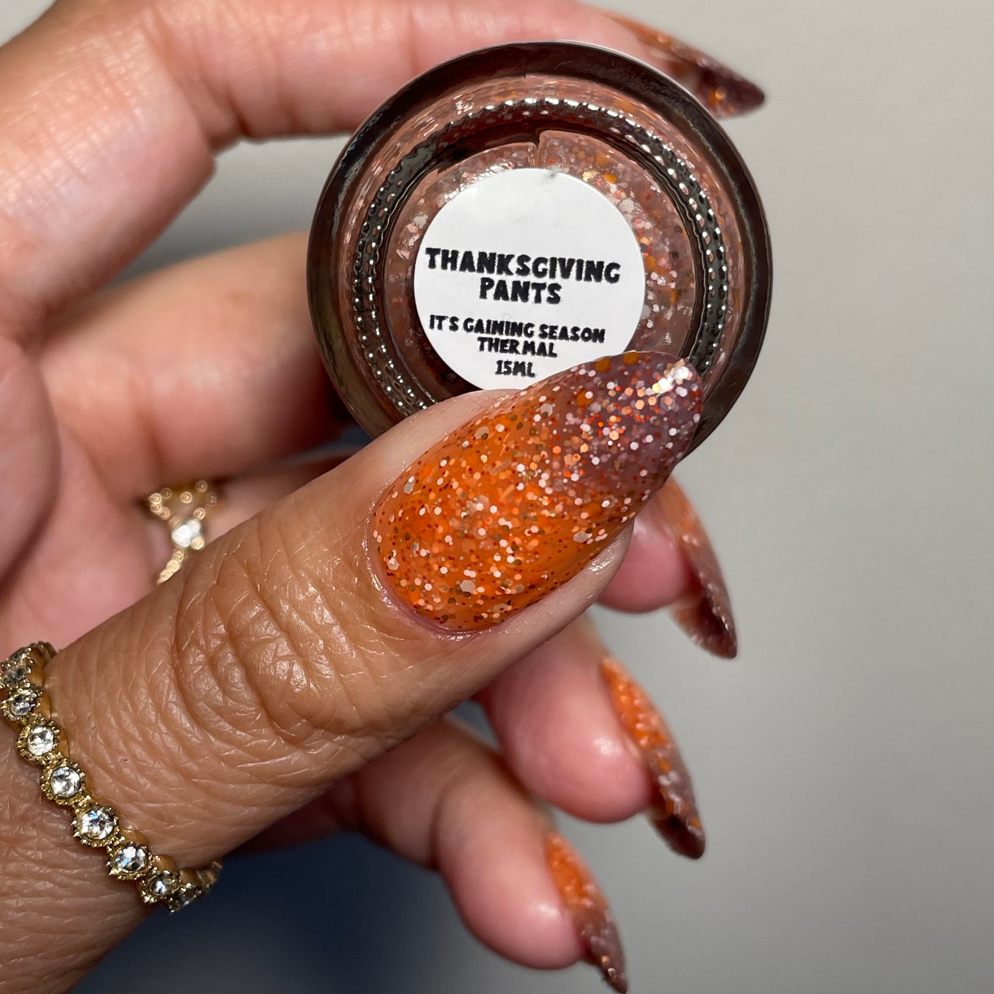 A thermal crelly that transitions from a berry when cold to squash when warm. Loaded with various shades or orange glitters and thin bar glitters.